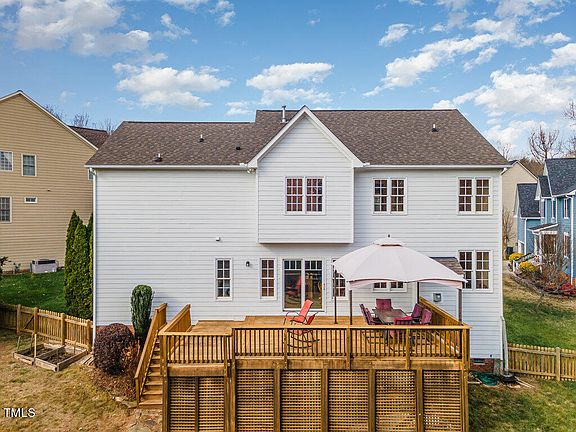 Just Listed in Wakefield's popular Berkshire community! Perfectly situated on a cul-de-sac lot, this charming four-bedroom home boasts a well-designed floor plan and features a beautiful formal dining room, separate living room, and a cozy family room with a gas log fireplace. The bright and open kitchen showcases a large island, gorgeous cabinetry, and a pantry with ample storage. Ideal for gatherings, it flows seamlessly onto the over-sized deck with an attached gazebo, perfect for outdoor dining and entertainment in your private, fully fenced backyard. Upstairs, discover a generously sized primary bedroom with a vaulted ceiling, ensuite bathroom with dual vanities, a jacuzzi-style tub, separate shower, and a huge walk-in closet. Three secondary bedrooms, two additional full bathrooms, and a spacious bonus room complete the second floor. Two car garage, laundry room on main level, swimming pool and clubhouse community. All in an ideal location... close to schools, dining, shopping, and major roads! Kitchen refrigerator with craft ice maker, chimnea, and basketball goal all convey. Welcome Home!