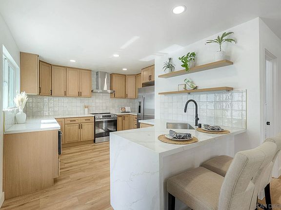 Discover this beautifully renovated, turnkey home where pride of ownership shines inside and out. Every detail has been updated—from new paint, trim, and doors to modern vinyl flooring and energy-efficient dual-pane windows. The open layout fills with natural light and flows into a stunning kitchen featuring quartz countertops, shaker cabinets, tile backsplash, and a full suite of new stainless steel appliances, including a slide-in range, built-in microwave, dishwasher, and refrigerator with water and ice. Both bathrooms offer floor-to-ceiling tile, new vanities, mirrors, and bathtub with sliding glass enclosure. Each bedroom enjoys its own mini-split system for personalized comfort, plus wood-framed mirrored closet doors. Step outside to a massive flagstone patio perfect for entertaining or relaxing with panoramic city and mountain views. Located on a quiet street in the heart of Lemon Grove—just minutes to freeways, shopping, schools, and downtown San Diego—this property combines suburban tranquility with unbeatable convenience. The driveway and street are scheduled to be paved within the week. Pictures of the driveway have been digitally enhanced to show what the driveway will look like once completed.