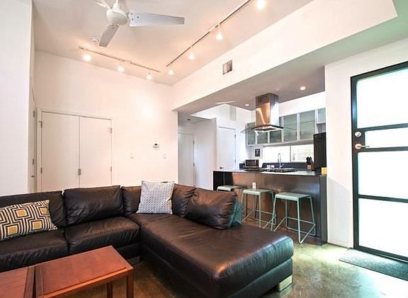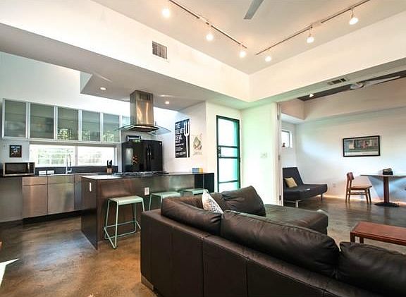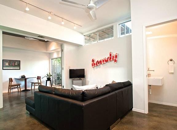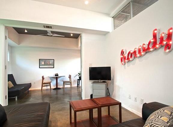 Fully furnished. Perfect for corporate rental or those relocating to Austin. Unique modern home, 2 bdrm w natural Qn mattresses + semi-private den/guest room - 1.5 bath. Utilities + ultra high speed internet paid. Private fenced yard, lush bamboo + outdoor shower! Tankless water heater provides endless hot water. Upstairs balcony off master bedroom. Private garage parking. Backs to Launderette and and only two blocks from Town Lake. Excellent location in hip East Holly, less than 10 min to downtown.