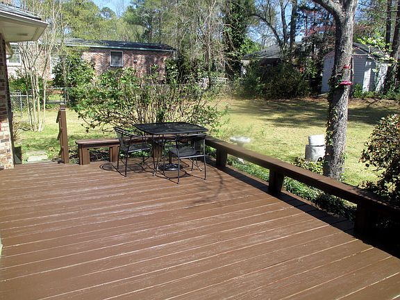 This 3 bedroom, 2 bath, brick, one story home is located on a quiet cul-de-sac in Forest Acres. It has a nice foyer with parquet flooring, formal living and dining rooms, and a den with fireplace. The kitchen has solid surface counters, a new cook top and hood vent, a breakfast area, lots of cabinets, and is open to the den. The den and master bedroom each lead to a deck that overlooks a large fully fenced backyard. Master suite is large and has a double vanity and walk-in closet. 2 car attached garage with workshop/storage room behind.