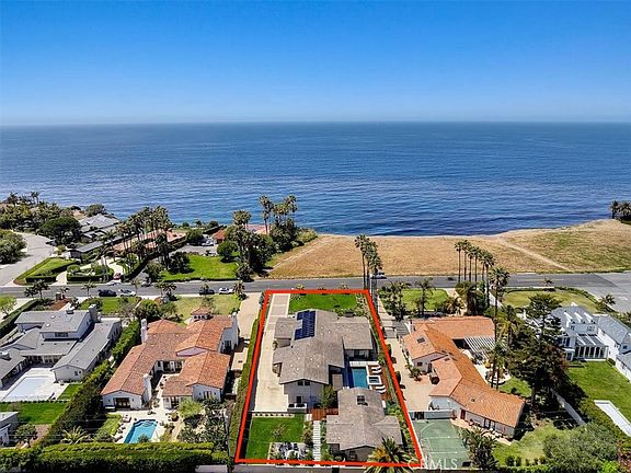 Welcome to this spectacular ocean view estate located on one of Palos Verdes Estates’ most prestigious streets, directly across from the scenic Lunada Bay bluff. This exceptional contemporary residence was built in 2015 and offers the perfect blend of modern sophistication, luxurious amenities and a breathtaking coastal setting. Boasting five bedrooms in the main house plus an additional bedroom in the approximately 900-square-foot detached casita, this property is designed for both grand-scale entertaining and everyday comfort. Inside, soaring cathedral ceilings and wide-open living spaces create a light-filled atmosphere. The formal living and dining rooms open through expansive doors to a stunning outdoor sitting area with ocean views of the Pacific. At the heart of the home is a chef’s kitchen anchored by a massive stone-topped center island and breakfast bar. Outfitted with Thermador appliances—including a six-burner double oven range, steam oven, separate freezer, and side-by-side refrigerator—it also features a separate scullery with a second oven, range, sink, and ample cabinetry, ideal for hosting larger gatherings. The kitchen is part of the show-stopping great room, which features a floating fireplace and opens to a resort-style backyard with a pool, spa, and fully-equipped outdoor kitchen. Designed by a renowned landscape architect Di Zock, this outdoor area combines Ipe wood decking, stunning plant selection, a covered lounge area, dramatic outdoor lighting, a grassy play area, and a fire pit with outdoor seating. The main-level primary suite offers ocean views, a custom walk-in closet, wood floors, a cozy fireplace, and a spa-like bath with a two-person soaking tub. Upstairs, you'll find an additional family room and two private en-suite bedrooms. The detached casita provides a full living room, kitchen, bedroom, and bath—ideal for guests, extended family, office, or gym space.