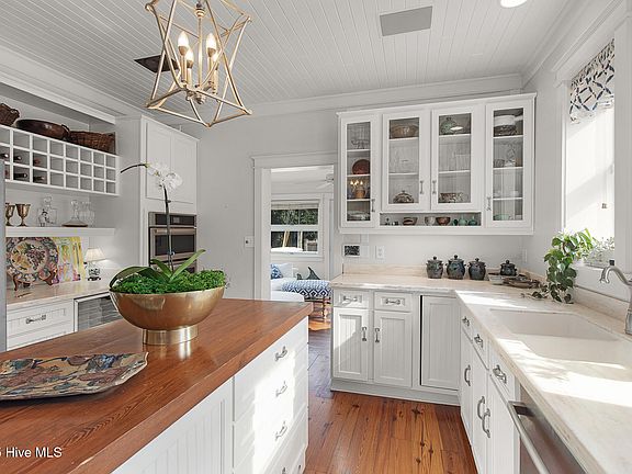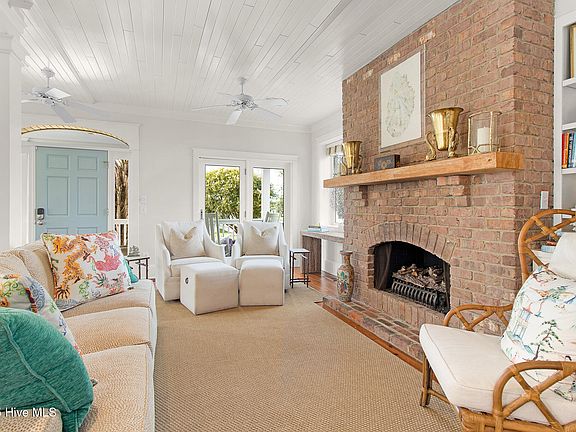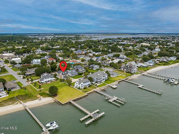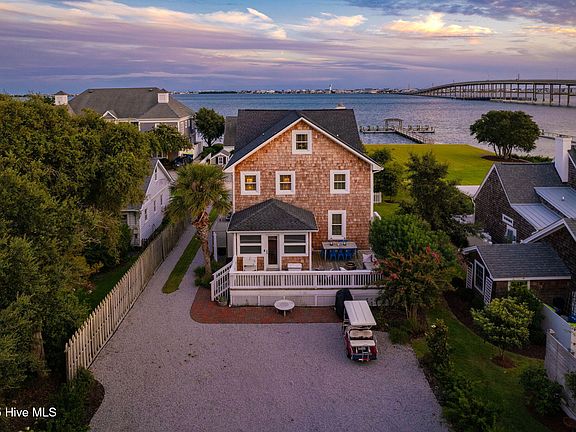 Tucked away at the end of Shepard Street, just one row back from Bogue Sound, this charming 3-story cedar shake home offers 4 bedrooms and 4 baths, along with an abundance of coastal character. An inviting front porch sets the tone, leading inside where warm wood floors and beadboard ceilings flow throughout the bright and open first floor. The spacious living and dining areas feature a brick fireplace with built-ins, a wet bar, and easy access to the kitchen, complete with white cabinetry, butcher block island, gas cooktop, and wall oven and built- in microwave. A sunroom extends to a wraparound deck, the perfect place to take in gorgeous views of Bogue Sound. Also on the first floor, you'll find a comfortable guest bedroom and bath. The second floor is home to the primary suite, offering sound views, a walk-in closet, and an ensuite bath with dual vanity, tile shower, and soaking tub, along with two additional guest bedrooms and another full bath. The third level completes the home with a large bonus space featuring built-in beds and a full bath—an ideal retreat for extra guests or a private getaway. Just steps from a public sandy beach sound access, this home beautifully combines relaxed coastal living with plenty of space for family and friends.