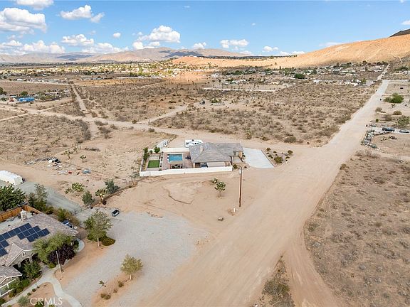 Luxury, Privacy and Stunning Views! Welcome home to this stunning 3-Bedroom, 3-Bath, 2253 SF Desert retreat. A true jewel nestled on a sprawling 2.5-acre lot with breathtaking views along with every amenity you could dream of. This thoughtfully designed home offers DUAL PRIMARY SUITES, each with spa-inspired bathrooms featuring walk-in showers, jetted tubs, and spacious walk-in closets-Ideal for privacy, comfort, or multi-generational living. At the heart of the home is a chef's kitchen designed to impress, complete with high end appliances, expansive countertops, and plenty of storage-a true culinary haven for entertaining or everyday living. The elegance continues throughout with tile flooring, plantation shutters, crown molding with ambient lighting, ceiling fans in every room, and French doors that blend indoor comfort with outdoor living. Step outside to your private resort-style backyard, where luxury and tranquility meet. Custom Pool and Spa with cascading waterfalls, fire bowls, and an automatic pool cover. Outdoor kitchen/BBQ for year-round entertaining, sunset dinners, or enjoying a quiet morning coffee. Pergola-covered patio, putting green for the golf enthusiast, vinyl privacy fencing along with desert friendly landscaping. Gated front courtyard with water feature and beautiful decorative stack stone enhances the entry. Additional features include oversized 2-car garage, RV pad, Security cameras/alarm system. Per County of San Bernardino, up to two (2) additional ADU units can be built per 2.5 acres, ideal for guest quarters or income potential. Whether you are seeking a peaceful desert sanctuary, a forever home with room to grow, or an entertainer's paradise, this exceptional property checks all the boxes. Come experience the lifestyle you've been dreaming of.