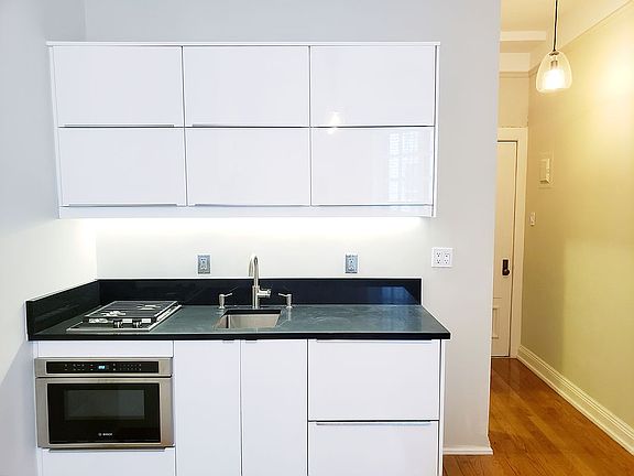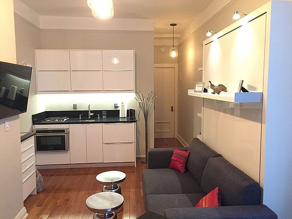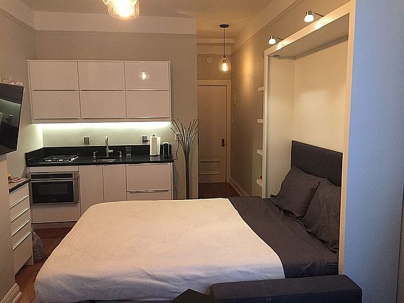 Mint prewar studio featuring Wolf & Bosch appliances, hardwood floors and elegant moldings.