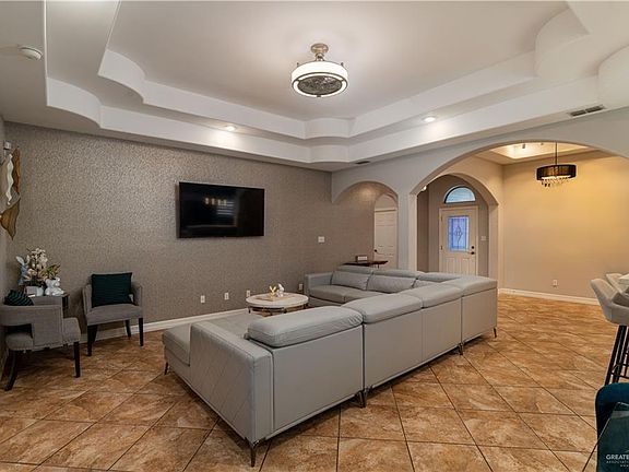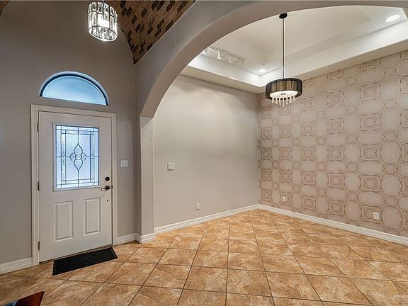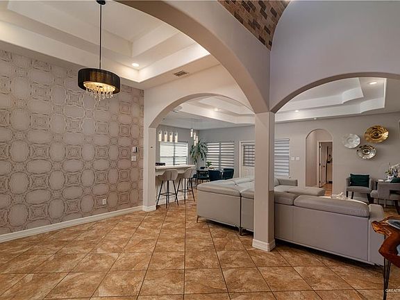 Discover elegance in this beautiful 3-bedroom, 2-bath home, showcasing high decorative ceilings and luxurious wallpaper in the formal dining and living areas. This home features a modern updated kitchen with beautiful quartz countertops. The master suite is designed for relaxation, featuring a garden tub, his-and-hers vanities, a separate shower, and a spacious walk-in closet. The backyard offers a large covered patio with stunning stamped concrete—perfect for relaxation or entertaining. Situated just 8 minutes from the International Bridge and 15 minutes from The Plaza Mall, this home combines luxury with an excellent location.