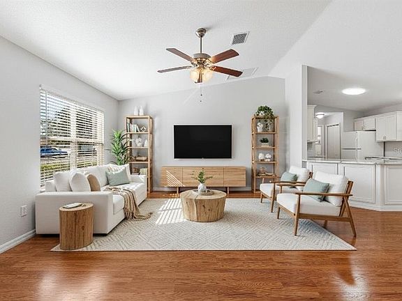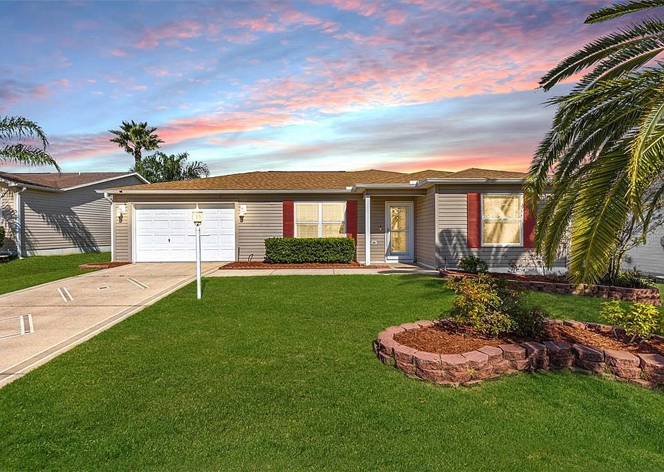 One or more photo(s) has been virtually staged. Stylish Comfort in The Village of Amelia! Beautifully updated Austin Model home located in the highly desirable Village of Amelia, centrally positioned in The Villages, Florida. This home features wood laminate flooring throughout (NO CARPET) and INSIDE LAUNDRY for added convenience. Enjoy excellent curb appeal with tasteful landscaping, an epoxy-coated driveway and walkway, and peace-of-mind with a hilltop location. The interior offers vaulted ceilings, freshly painted walls, and luxury granite countertops in the kitchen and bathrooms. A large covered and screened lanai provides a comfortable outdoor living space surrounded by privacy landscaping that’s easy to maintain. This home combines style, comfort, and location — just minutes from golf, recreation centers, shopping, and dining. ***NEW ROOF APRIL 2025*** Move-in ready and waiting for you!