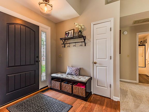 Yorktown schools. Well-maintained and updated home close to Ball State University and Hospital. Split bedroom floor plan with cathedral and vaulted ceilings. Engineered hardwood flooring in entry, dining room, and kitchen. Great room features vaulted ceiling and gas fireplace with new air stone & mantle. Fourth bedroom or flex room includes cathedral ceiling and double closet. Kitchen features stainless steel appliances, pantry closet, and planning desk. Spacious main bedroom suite includes attached bath with new waterproof flooring, wainscoting, double sinks, walk-in closet, and linen closet. Guest bath includes newer laminate flooring, updated lighting, and tub/shower combo with new glass doors. Utility room offers custom shelving and folding counter. Additional updates include newer light fixtures throughout, new air conditioning and water heater (2018), and new overhead garage door (2017). Plantation window blinds and shutters throughout. All new carpeting installed within the last 4 years. New patio door added in 2025.