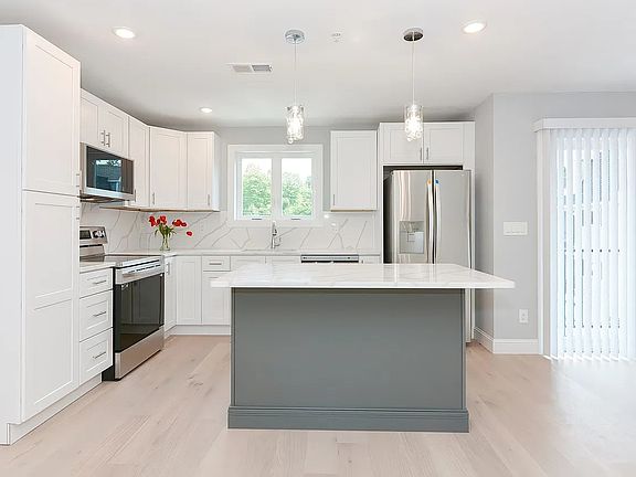 The kitchen is a highlight, showcasing sleek quartz countertops, a center island, & generous cabinet space, all complemented by stainless steel appliances.