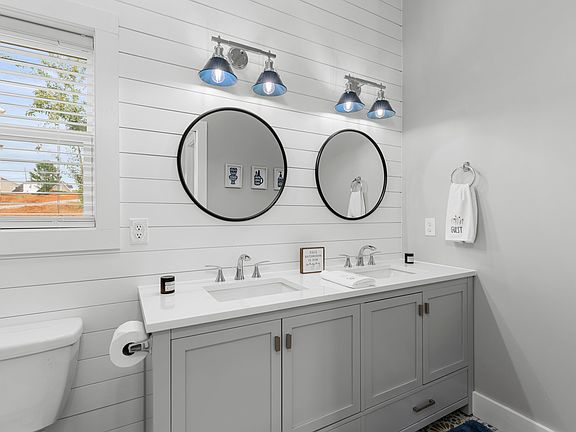 Modern farmhouse styleStainless steel appliancesShaker style cabinetsLuxurious kitchen finishesCeiling fansWood grain flooringGranite countertops
