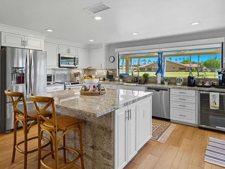 BEAUTIFULLY REMODELED home in the friendly Chaparral Country Club community! This 3BR/3BA END UNIT features the ever-popular open style kitchen with an OVERSIZED PICTURE WINDOW, large granite island and WOOD PLANK STYLE FLOORING. Bright white cabinets, crown molding and updated doors/hardware throughout. 3RD STALL GARAGE! Motorized window coverings in the kitchen and living room, crown molding and canned lighting. Inviting TILED PATIO with a lumawood trellis and VIEWS of the 13th fairway and lake! UPGRADED BATHS! Chaparral is centrally located in the heart of Palm Desert featuring an 18-hole golf course designed by Ted Robinson, a full-service restaurant, fitness center along with tennis/pickleball courts. Just a short drive to the famed El Paseo shopping district.
