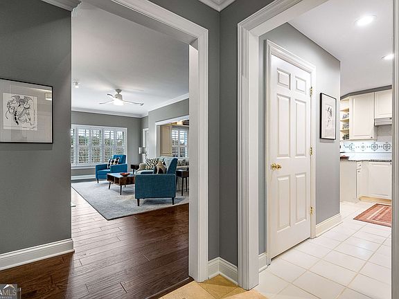 Quiet, secluded living at Heritage Place, a beautifully updated 2-bed, 2.5-bath condominium tucked on a quiet street off Peachtree in Buckhead with sweeping views of the Bobby Jones Golf Course from your private "treehouse" patio; enjoy amazing sunsets, walkability to trails, tennis, golf, pickleball and the upcoming 2026 Beltline. The light-filled foyer opens to a main living area with a gas fireplace, built-in bookshelves, gleaming hardwoods and new lighting; the open kitchen overlooks the living and dining rooms and features stainless steel appliances, granite counters, tiled backsplash and ample storage, and all appliances plus washer/dryer remain. The primary suite fits a king bed, offers custom closets and a fully renovated bath with frameless shower, new vanities, tile floors and a towel warmer; the guest room/office also has an updated en-suite. Recent major upgrades include new flooring, a water heater and an HVAC (2022), and the community adds a media room, gym, pool and club room, three dog runs, and easy access to Buckhead shopping and dining. This retreat delivers style, comfort, and panoramic views-an ideal Buckhead home where convenience meets serenity.