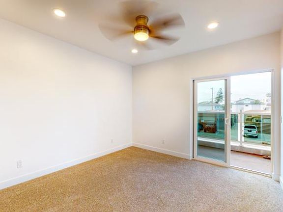 Clean private room on the 2nd floor with a sliding door to the balcony with views of palm trees and rooftop access. Carpeted room with a ceiling fan and built-in closet storage. The room is directly across from the shared bathroom in the hall. It is 168 sq ft total and includes some storage area in the garage and back shed if needed.