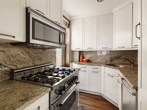 Enter through the proper foyer into the nearly 20 foot long living room. 4 large windows overlook a row of landmarked townhouses on 18th street to the South. The large foyer offers additional closet and pantry storage, with ample space for dining. The adjacent windowed kitchen is fully equipped, with a dishwasher, Bertazzoni range, and Sub-Zero refrigerator.