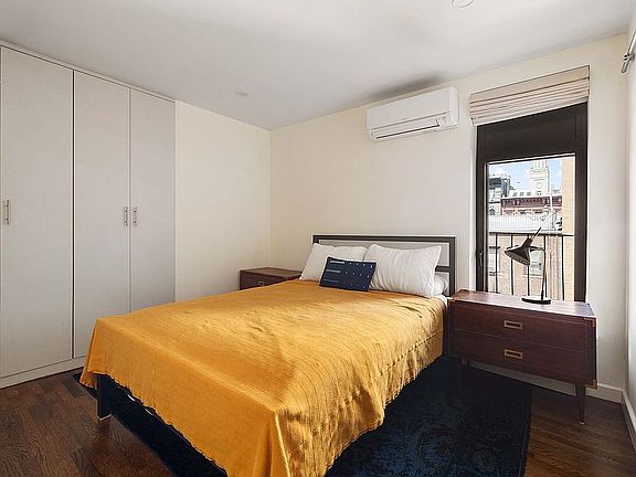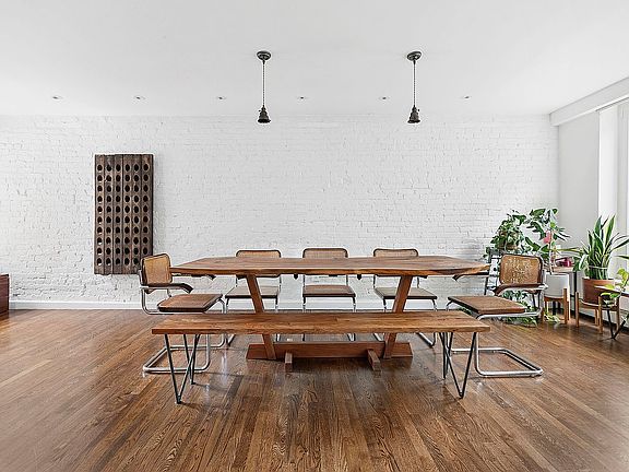 Perched four easy flights up, this bright and airy apartment features 3 exposures through twelve windows, automated custom blinds, and an incredibly spacious layout with endless possibilities. The extremely large living and dining areas — a rare offering in Manhattan (37.5 feet by 24.7 feet) — flow seamlessly, creating the perfect entertaining space with the ability to add a large third bedroom and additional bathroom, as other owners in the building have done. This home blends modern convenience with pre-war charm, offering the best of both worlds.