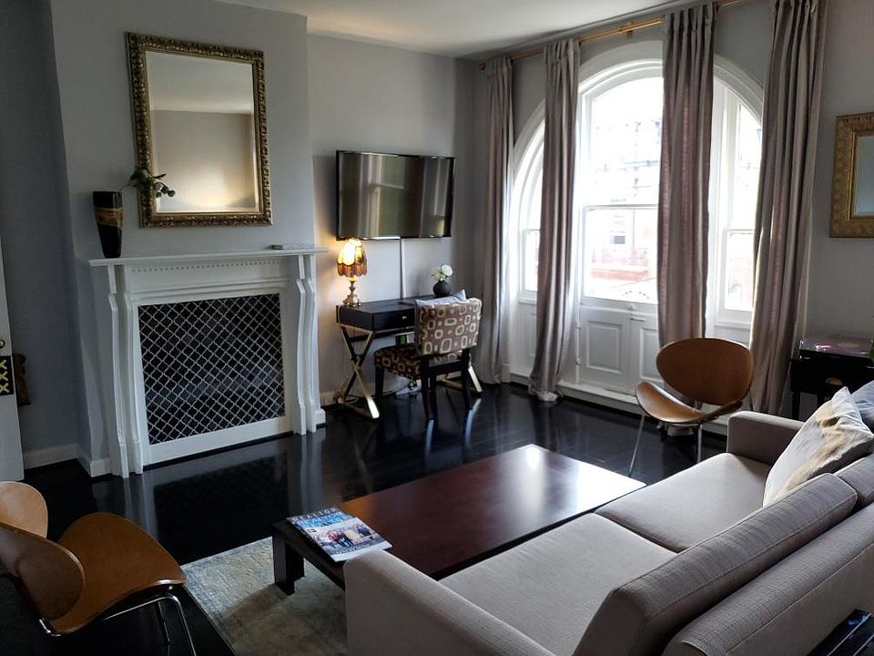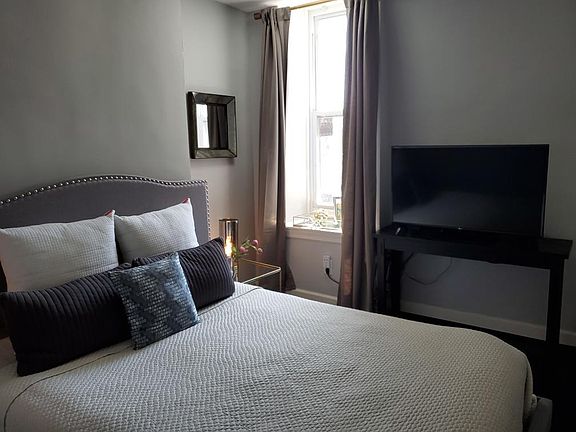 A sunny, spacious fully furnished Executive Suite/Apartment, in a 3-story 3-unit building. Located within blocks of Baltimore 's Penn Station. Less than a 10 minute walk to eateries on North Charles Street. The building has security cameras and is located on a beautiful well maintained block in historic Mount Vernon. You'll be in good company: Just two doors away from the iconic Ivy Hotel; around the corner from The Prime Rib steakhouse. This modernized apartment, with in-unit washer and dryer, chevron marble tile in the bathroom and updated granite in the kitchen. This unit still retains its original charm with a striking floor to ceiling arched window and walkout Juliet balcony. Sleek black floors throughout elevate this furnished suite, allowing it to stand out from its competition. This 3rd Floor apartment has everything you will need to feel cozy and at home. , For out-of-state weary travelers or relocating professionals, this location will put you in close proximity to everything and living at Eleven11 Flats means random perks for you throughout the year. Our tenants are happy. Come find out why!
