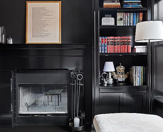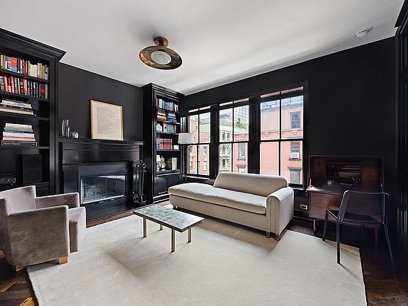 The apartment is inviting and open, with bespoke details throughout—custom herringbone solid walnut floors, high-gloss black oil-painted trim, and grand double-hung windows overlooking charming Elizabeth Street. In the living area, the centerpiece is a wood-burning fireplace with an oversized mantle, flanked by elegant French doors leading to the bedroom.