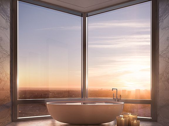 The two 44-story glass towers, designed by Pei Cobb Freed, provide unparalleled panoramic views with 10 feet ceilings and floor to ceiling glass. Entrance to the tower is through a 24-hour Gate to the valet. The exclusive 24- hour services and amenities include a pool, fitness center, spa, screening room, library, game room, personal wine storage, dining rooms, and 24-hour concierge service. Residence 17B is a two bedroom, two-and-a-half-bathroom residence complete with a formal 26' entry foyer that leads directly into the expansive great room featuring a gas fireplace and access to the 20' terrace and private den, offering breathtaking views. The master bedroom features an oversized walk in closet, en-suite five-fixture master bathroom, and private terrace. On the opposite end of the residences is the second bedroom, complete with an en-suite bathroom. This residence features a private elevator lobby.