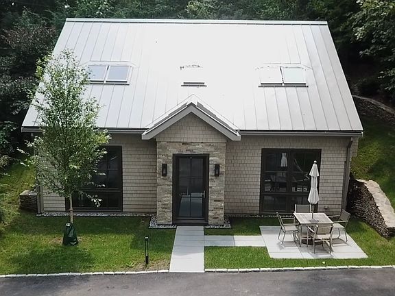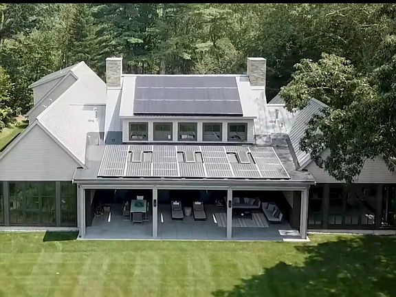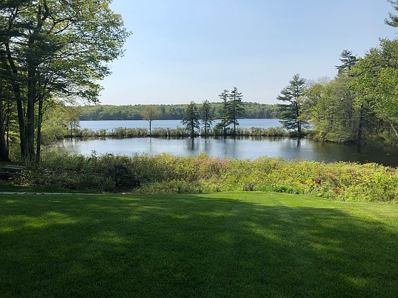 A new lake front, single level home built in 2018 on almost 10 acres on Farm Pond with a separate carriage house