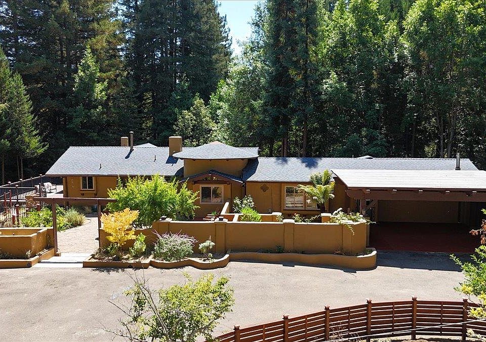 This unique property exudes peace & tranquility, offering versatile living spaces & enchanting outdoor areas designed for relaxation & connection. The main home features 2 bds, 2 ba, plus a bonus room that could serve as a library, home office, or even an additional bedroom. Attached is a permitted ADU including its own private entrance, a lovely courtyard, & back deck, making it perfect for guests, extended family, or rental income. Enjoy it as a 2-bd, 2-ba home w/ a bonus room & an ADU - Or as a 3-bedroom, 3-bath retreat, with a bonus room. The open-concept layout seamlessly connects the kitchen, dining, & living areas, anchored by an oversized stone fireplace. The primary suite is its own sanctuary, complete with a wood-burning fireplace, & a spa-like bathroom featuring a Jacuzzi tub set before a bay window with tranquil forest views. A large wraparound deck invites you to soak in the surrounding nature, while the welcoming courtyards feature pomegranate, lemon & fig trees, cozy conversation pits, & 2 outdoor showers, create magical spaces to gather & unwind. Plenty of parking, offering a large carport with a built-in shed/workshop & room for an oversized vehicle. Whether you're looking for a peaceful getaway or a versatile home with income potential, this gem is a must-see.