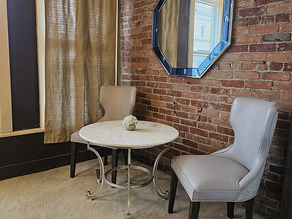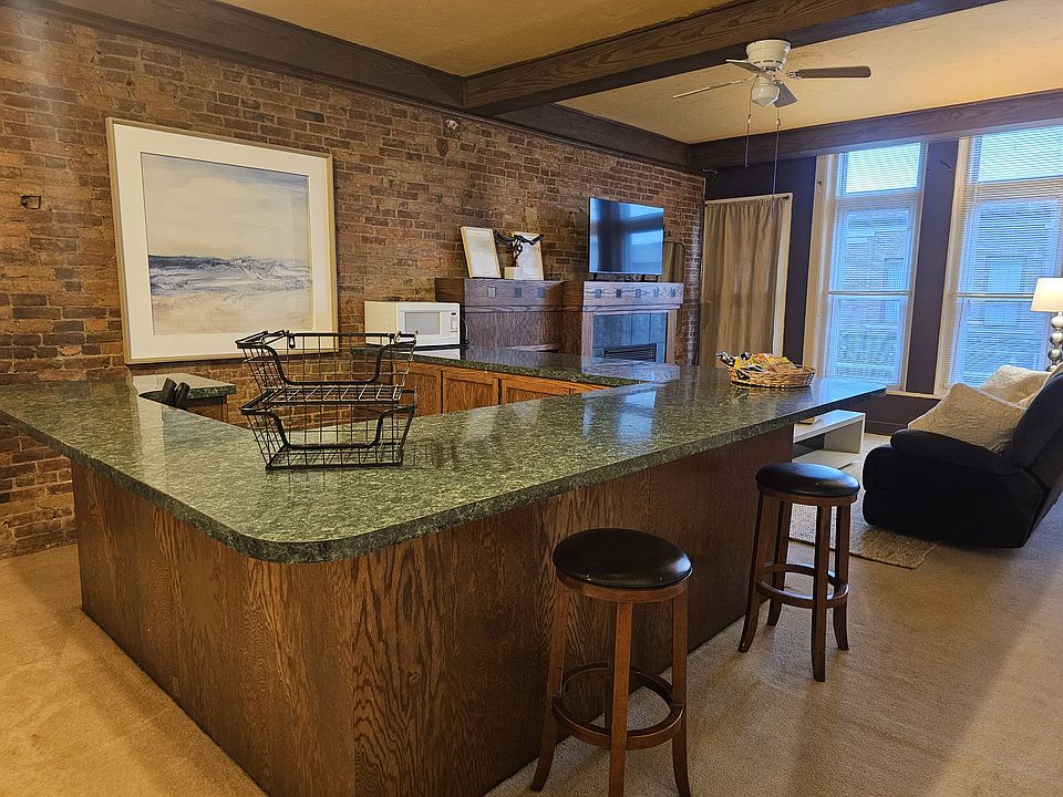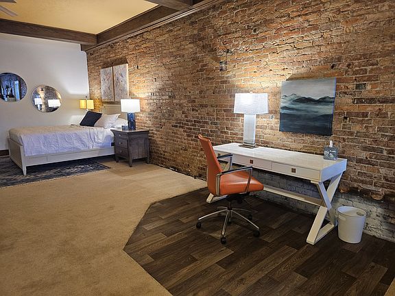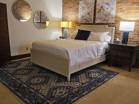 Large open concept featuring high ceilings with beautiful wood beams and exposed brick. Lots of natural light. When you walk into the unit you see the huge kitchen island. Queen bed, designated living room with a gas fireplace. Sitting area for 2 in a nook behind the living room. Large walk in closet with lots of shelf space. Spacious bathroom with a walk in shower. Tasteful art through out.