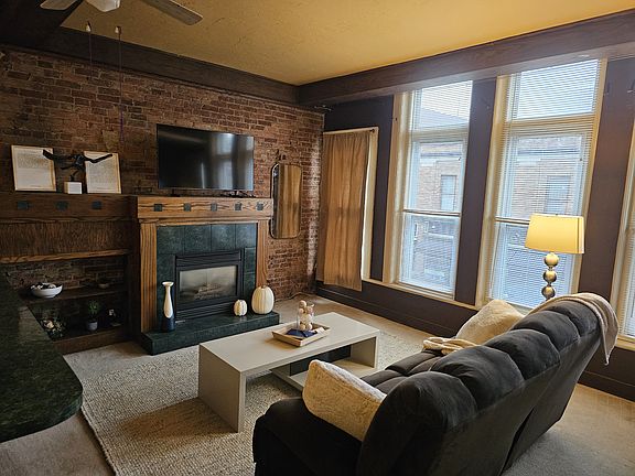 Gas fireplaceHuge kitchen islandOpen conceptExposed brickLots of natural light