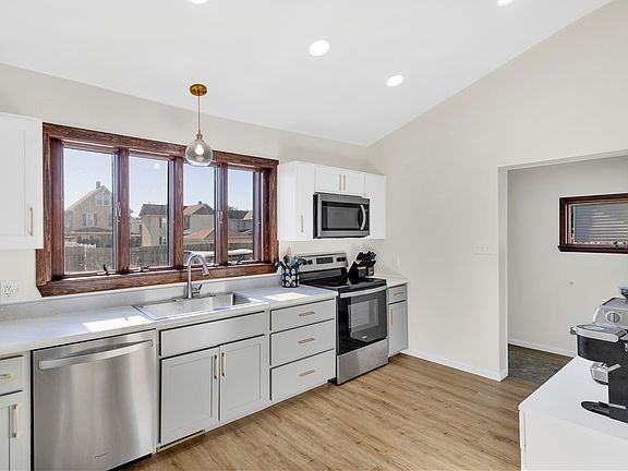 Gold finishesSleek stainless-steel appliancesFirst-floor primary suiteNew carpetFenced private backyardLarge windowsBright dining room