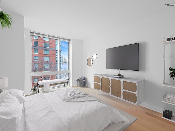 Experience luxury green living at Apartment 11F in The Verdesian, located in the coveted Battery Park City neighborhood of Manhattan. This one bedroom features a lovely sunset view of the Hudson River and overlooks peaceful Teardrop Park. You will enjoy 746 square feet of efficiently designed space accented with extra-large windows plus lots of light. The living area has plenty of space for full-sized furniture and a dining table with chairs. The generous bedroom allows for any size bed and additional furniture. There is a washer-dryer tucked away in a cabinet next to the bath. The kitchen opens to a breakfast bar and features large appliances, cabinets, and room to prep your meals.