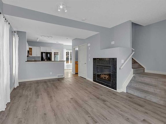 END UNIT! 3 bedrooms, 1.5 bathrooms, 2 PARKING STALLS & LOW FEES! With freshly cleaned carpets, a new coat of paint, a perfect layout and a cute backyard this home has it all! Stepping inside the front entrance you are welcomed by a bright and airy open-concept layout with modern finishings/colours, 9 foot ceilings and huge windows that fill the home with natural light throughout the day. The living area has plenty of space for big comfy furniture to watch movies or relax in front of the fireplace. The U-shaped kitchen features ample counter space and seating for guests, plenty of cabinetry and a new dishwasher. Adjacent to the kitchen is a dining area with a lovely window that overlooks the south-facing backyard, this nook is the coziest spot for morning coffee! This area also leads to a fenced backyard with a large mature tree that provides privacy to enjoy summer evenings on the (concrete) patio. The main floor is completed with a 2 piece powder room and a coat closet at the front door. On the south side of the second level you will find a huge primary bedroom with an awesome flex area that would make a perfect reading nook or glam station. This private retreat overlooks the backyard, boasts a big walk-in closet, and features a cheater ensuite door to a four piece bathroom with deep soaker tub. The second level is completed by two more bedrooms on the north side of the home (nicely separated from the primary bedroom) and large linen closet. The basement houses a newer washer and dryer, and features a big window and bathroom rough-in for future development. Right outside the door are two parking stalls with plug-in and plenty of visitor parking. This home is a 5 minute walk to the elementary school and a 3 minute drive to all amenities such as health services, rec center/pool, arena, groceries, hardware stores and retail. BONUS: hot water tank replaced in 2024.