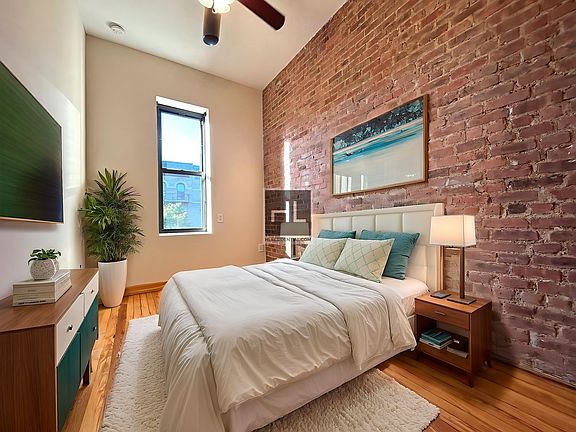 Exposed brickStainless steel appliancesHardwood floorsFull size bedroomQueen size bedroomEat in kitchen