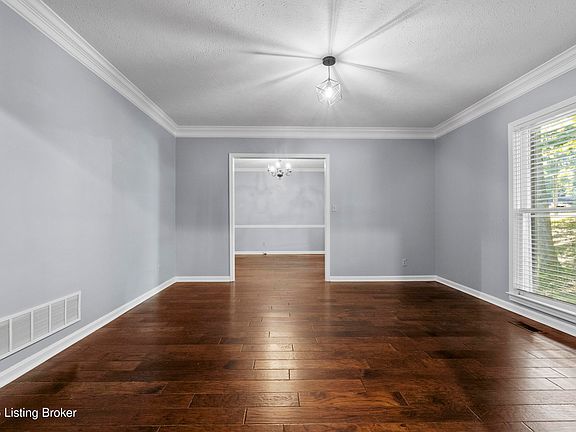 Surrounded by trees and tucked away for privacy, this home offers a peaceful backyard with natural views and a deck perfect for relaxing or entertaining. Inside, vaulted ceilings with a skylight, hardwood floors, and oversized windows fill the home with natural light, while two fireplaces invite cozy evenings and add charm to the living spaces. The main level features two bedrooms and a full bath, along with a primary suite with its own ensuite, and the oversized 2.5-car garage provides abundant storage or workshop space. With first-floor laundry and a location just one mile inside the Oldham County line with easy interstate access, this bright, airy home blends comfort, convenience, and the feel of a private getaway.