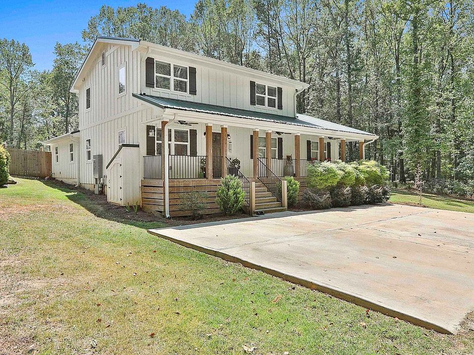 Prepare to FALL IN LOVE with this picture perfect 4 bedroom - 3 1/2 bath farmhouse that has been completely remodeled. This beautiful home with a charming front porch and resort-style backyard is perfect for entertaining! The interior boasts wide plank LVP flooring throughout the entire home, upgraded lighting, 400 amp electrical service, spray foam insulation in walls and ceiling, 2 New HVAC units installed in 2019, the plumbing, electrical wiring and mechanical systems were replaced in 2019, Custom Kitchen with Stainless Steel appliances, a fabulous great room with brick fireplace and shiplap accent, impressive owner's retreat on the main level with spectacular spa bath complete with a soaking tub in the oversized decorator shower with floor to ceiling designer tile! The second level boasts 3 additional bedrooms with tons of natural light and 2 full bathrooms. The exterior boasts a 30 x 40 Storage building, with a Roll up door, and a separate mini split unit that was installed in 2021, PLUS a fenced-in backyard, complete with a Like New gunite pool with spacious pool decking for endless outdoor enjoyment! This Gorgeous home on 2.25 acres is less than 4 miles from Interstate 85 @ the Poplar Road exit and is within walking distance to Hunter Recreational Complex, and Poplar Road Elementary School!