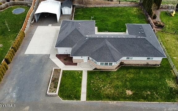 Desired location on a quiet Cul de sac. Home has a feeling of an open space. with vaulted ceilings, large windows with an abundance of natural light. Large kitchen, dining have French doors that led to the large back patio. Large Primary suite consists of bedroom, tub, shower and walkin closet. Private door opens onto the back patio. This 4bed, 3bath sits on a 0.44-acre lot. Hugh 3 car attached garage. Large carport/storage building with an additional storage shed. Has Tieton Irrigation. Home has been well maintained.New carpet throughout. Call today for details. 509-969-7125.