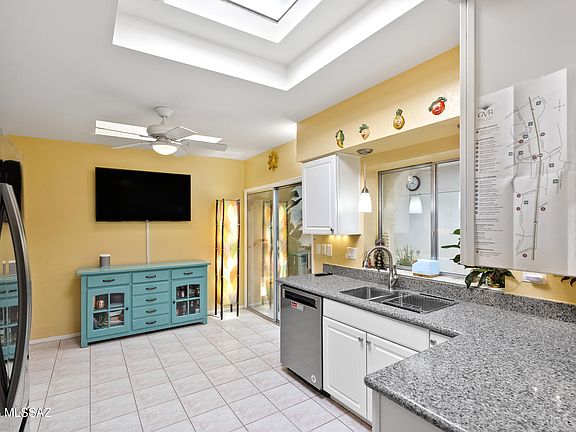Lender Paid .5% Rate Buy Down Available for one year, must qulaify for loan restrictions apply. Experience the sought-after lifestyle of Esperanza Estates, an active adult community. Spacious Mediterranean-style courtyard, ideal for large gatherings under elegant sail shades. The courtyard comes alive at night with beautiful lighting, and the transition to the interior is seamless via a large tiled breezeway--great for setting up events. Inside, enjoy the natural light of 8 skylights, an open-concept layout featuring a well-appointed kitchen with a large TV, a roomy Great Room for dining and entertaining, and a sunroom with mountain views, perfect as a home office or den. The primary bedroom has a spa-like en-suite bath, while the second bedroom and full bath easily accommodate guest Upgrades include Magnolia shutters, whole home water filtration, instant hot water with timer, all-ceramic tile floors (no carpet), a 2025 roof resurfacing, regularly serviced HVAC in pristine condition, and abundant outdoor seating, like the covered backyard patio for year-round enjoyment. The garage provides enclosed storage, shelving, and overhead space. Within a 5-minute walk, you'll find a pool and spa, plus plenty of community amenities and terrific neighbors. Conveniently located in North Green Valley, just under a mile from Hwy I-19, the home offers low-maintenance landscaping and orange and grapefruit trees accessible from the back patio.