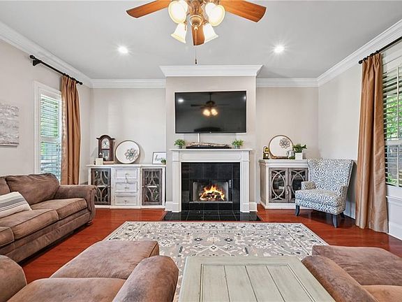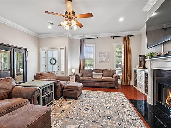 Exceptionally maintained garden home in gated Orchard subdivision has everything you've been looking for. Off-street parking with 2-car attached garage, professionally landscaped yard with sprinkler system and inviting wrap-around brick courtyard. The spacious living room with wood burning/gas fireplace flows perfectly into your dining space and gourmet kitchen, offering an oversized kitchen island for seamless entertaining. NO CARPET, with beautiful real Cherry wood floors and tile throughout. 10 foot ceilings, with custom millwork, triple crown molding and solid wood doors are just a few of the details you'll appreciate. Step out onto the covered French Quarter style courtyard for morning coffee or afternoon relaxation. No neighbors on one side, offering plenty of shade and privacy. Location is convenient to shopping, restaurants and the I-12 corridor. It is an absolute must see!