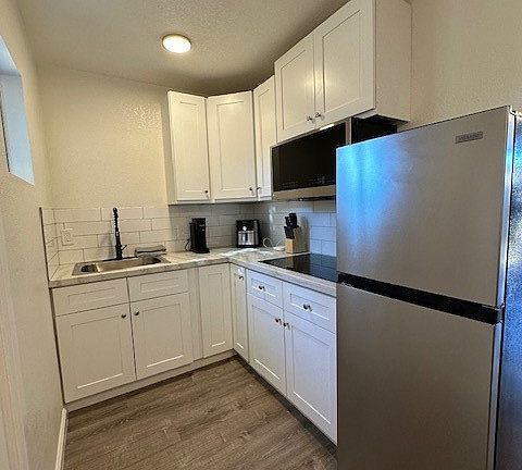 This fully furnished 1-bedroom, 1-bath rental, remodeled and truly move-in ready. This home comes with everything you need, from bedding and towels to pots, pans, and kitchen essentials. The updated kitchen features an electric cooktop, microwave, stainless steel refrigerator, and a cozy dining area with a small table. The living room offers a comfortable couch and TV, creating a perfect space to relax. A clean, modern bathroom and a well-appointed bedroom complete this easy, turnkey rental.
