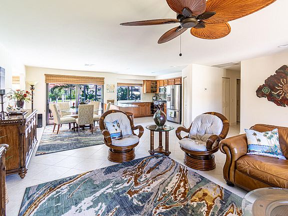 Expansive lanaiQuartzite countertopsNewly resurfaced poolRear yard fencingDual-fuel double oven rangeLush tropical landscapingWaterfront home