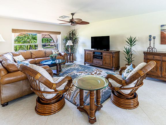 Perfect for entertaining or unwinding, the expansive lanai features modern ''picture window'' screens and a newly resurfaced pool with a variable-speed pump and heater, surrounded by lush tropical landscaping. Enjoy evenings by the firepit on the patio overlooking the water, or take advantage of the modern plumbed and electrified boat dock with a 13,000 lb lift.