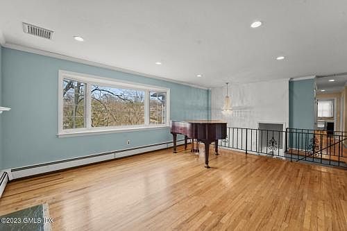 Charming, bright sun filled home with river view, just around the corner of award winning North Mianus school Sunny living room with a fireplace, dining room adjacent to eat-in kitchen. Sliders in the kitchen to the patio/deck enables easy outdoor entertaining. Primary suites with updated bathroom including a jet shower with double sized closets, 2 more bedrooms and a hallway full bathroom. The lower level is a wonderful space for family room/play room or an office. One car attached garage with abundant storage space. Convenient floor plan, minutes to shopping, schools, trains and I-95.Steps in the backyard leads to extra parking space and a shed on Neighborly Way.