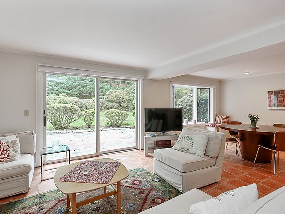 This airy, renovated, meticulously maintained, move-in ready Contemporary gem set on almost an acre (.86) of gorgeous land offers a spectacular, private indoor/outdoor oasis! This lovingly cared for home boasts three (four potentially) bedrooms, two-½ renovated bathrooms, two family rooms (one with vaulted ceilings and a marble-faced gas fireplace) and a sunny, formal living room, formal dining room, renovated chefs kitchen with skylights, and an informal dining area/sunroom with a wall of windows and exquisite views of the property. The outdoor area features a flagstone terrace with a large, in-ground, kidney-shaped pool, a mature forest with seasonal perennials, and a second flagstone patio on the lower level that leads to a grassy backyard. The open, modern floor plan allows for easy entertaining. All you need to do is unpack. Greenburgh Recreation.
