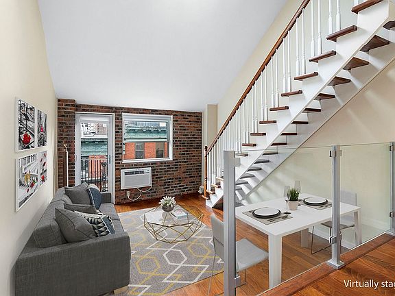 NO BROKER FEE. Bright and sunny. Loft like living in this generously sized 1 bedroom 1.5 bathroom Duplex Loft located in the heart of Greenwich village. Boasting full ceiling height second floor bedroom, a stately exposed brick wall that provides great character to this open floor plan gret views and private balcony. The first floor has a full bathroom and a stunning updated eat-in kitchen with a white quartz L-shaped countertop and stainless steel appliances overlooking the spacious living room that leads directly onto the balcony with some great views including the treetops on Thompson St. where you can enjoy some fresh air. Double-volume ceilings with a skylight hover over the open staircase which leads to the oversized bedroom area that offers a half bath, closet, and space for a King size bed and plenty of additional storage.