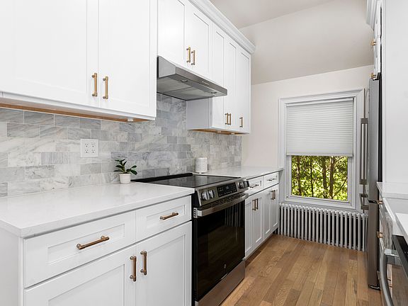 - Renovated custom kitchen with quartz counters, marble backsplash and stainless-steel appliances