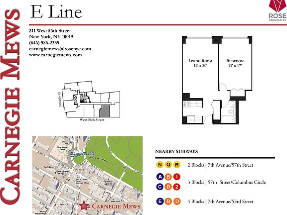 Located in the heart of New York's premier neighborhood for entertainment and the Arts, Carnegie Mews offers residents the excitement and convenience of being just moments from Carnegie Hall, Lincoln Center and Central Park as well as The Shops at Columbus Circle featuring a Whole Foods Market, a diverse selection of over 50 retail shops and a collection of culinary and dining experiences. Additionally, enjoy easy access to multiple Subway and Bus lines. Carnegie Mews provides a 24-hour attended lobby, on-site parking garage, valet services and a laundry facility.