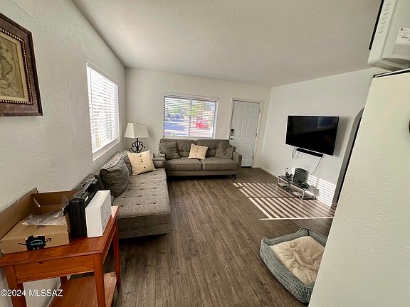 Discover comfort and convenience in this charming 2-bed, 1-bath condo. With 768 sq ft of space, enjoy a cozy living area, well-appointed kitchen, and peaceful bedrooms. This corner unit features include a private patio, one assigned covered parking space. New roof 2023, new exterior fence 2023 HOA includes common area maintenance and pool! Ideal for first-time buyers or investors seeking a low-maintenance lifestyle in Tucson's vibrant community. Priced to sell quickly, schedule your showing today! Co-Listing Agent is related to Seller. *TV does not convey*