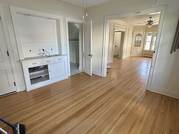 This is a 2 story apartment rental with some beautiful wood work and built in cabinetry. On the main level, you will find 1.75 bathroom, kitchen, large pantry, dining room, and living room. On the second level there is a HUGE master bedroom, 2 other bedrooms, and a full bathroom. There is a shared laundry space with free laundry on site. There is a small yard out the back door, leading you to a 2 different two stall garages. You would have access to 1/2 of a garage.