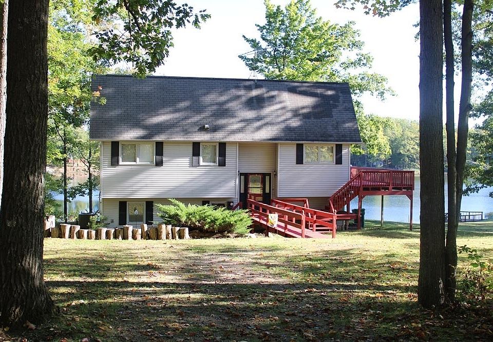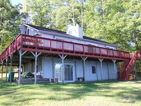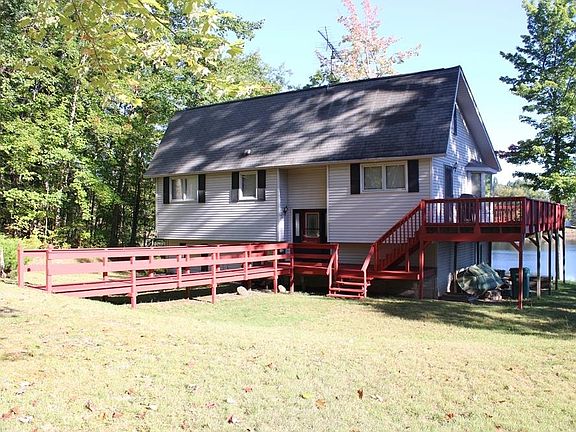 Beautiful setting on Private, Deer Lake. This well built home has room for family and friends with 5 bedrooms, 2 bathrooms, large family room with a fireplace, wrap around deck for outside entertaining, gas log fireplace in the living room, patio doors from the family room, living room and two of the bedrooms on the main floor. Some of the updates in the last 6 years include furnace and central air, flooring in the main level bedrooms and bathroom, sliding doors in 2 of the main floor bedrooms, gas log fireplace in the living room, tree removal, dock, freshly painted decks, deck stairs and walkway, septic pumped in the spring of 2025, landscaping along with other minor repairs. Deer Lake is a private lake that has nesting Loons, good fishing and an occasional Eagle flying over not to mention deer, turkeys and other wild life roaming by. This is a quiet lake perfect for kayaks, paddle boats, canoes and paddle boards. Sit on the large deck and enjoy a great view of the entire lake. If you're looking for a large waterfront home on a quiet lake this is for you.