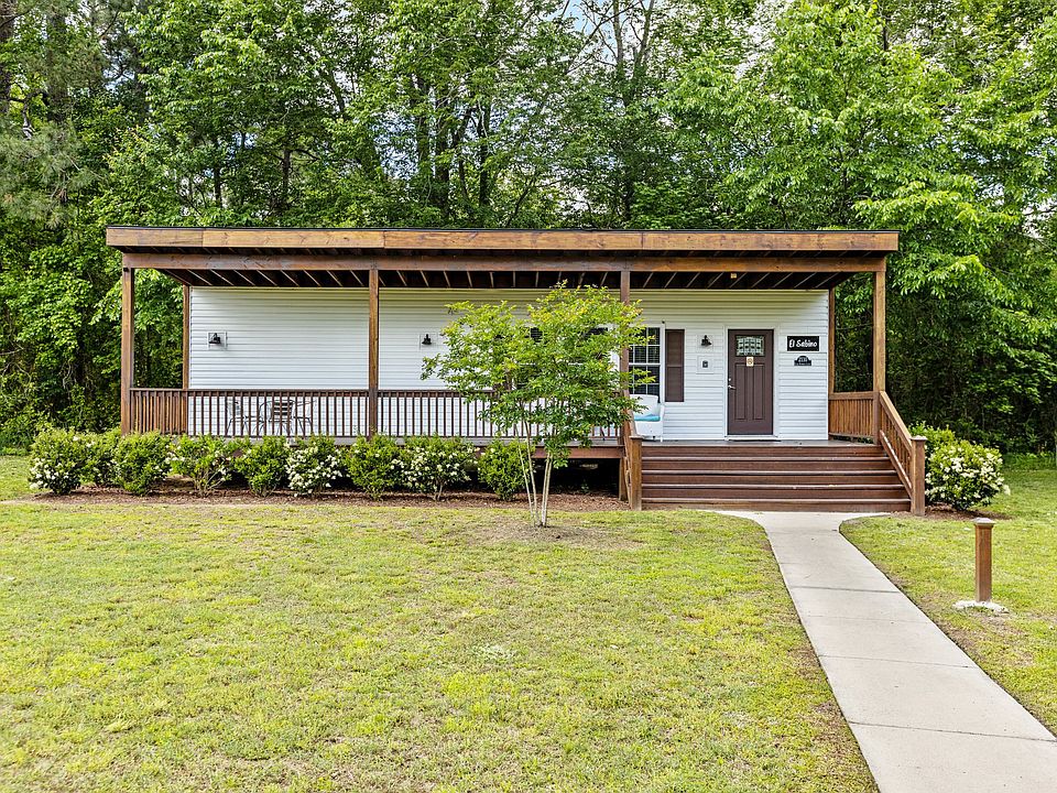 This cabin features a king-size bedroom, a fully equipped kitchen ready for all your cooking needs, and a large, inviting front porch perfect for relaxing and enjoying the outdoors. The property also includes grills, picnic areas, and sitting benches, providing plenty of space for outdoor activities and gatherings.