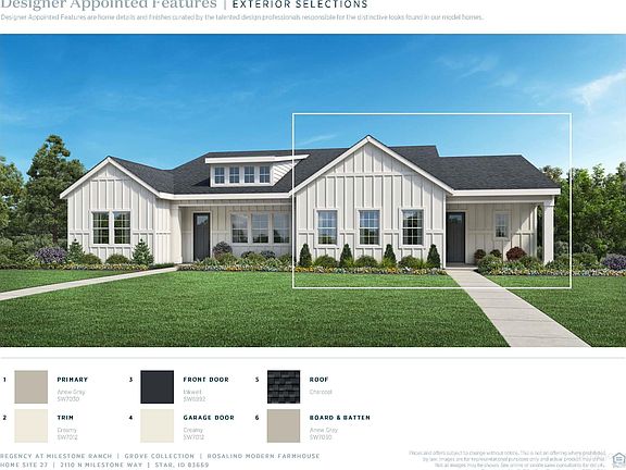 "The Rosalind." Discover the Regency difference at this premier new home community for 55+ active adults. Ideally located in tranquil Star close to hiking and biking trails, the Boise River greenbelt, and shopping, dining, and entertainment, Regency at Milestone Ranch is where luxury and lifestyle meet in exquisite fashion. Enjoy a stunning home built to the highest standards and personalized to your style, and a world of resort amenities just beyond your door. Events and activities create a true sense of connection and exciting opportunities to socialize with neighbors and friends. The Rosalind offers 2 spacious bedrooms, 2 bathrooms, laundry room, convenient workspace and 2 car garage. Home is under construction. Photos are similar. BTVAI