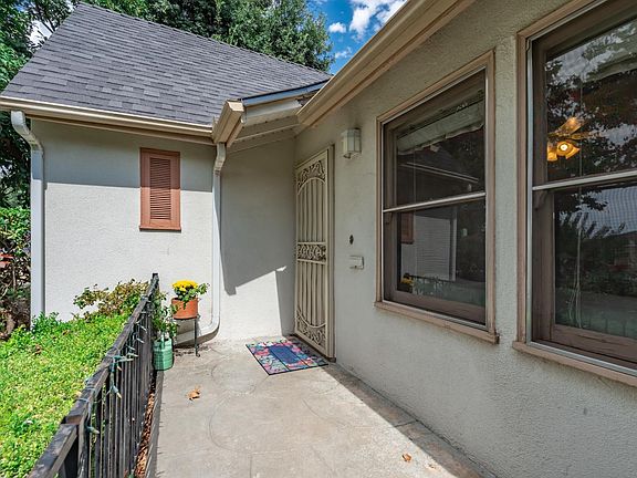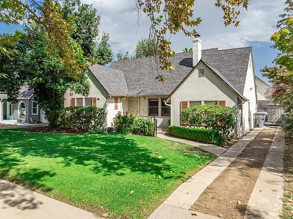 Welcome to this enchanting Tudor-style home in the heart of the Historic Fresno High District! With 1,799 sq. ft. of timeless architecture, NEW ROOF (2025), 4 spacious bedrooms, and 1.5 baths, this residence blends classic character with modern upgrades and endless lifestyle opportunities. Step inside to a welcoming living room anchored by a wood-burning fireplace, creating a cozy atmosphere for cool evenings. Elegant details such as crown molding, wooden blinds, ceiling fans, and a combination of laminate, tile, and carpet flooring add charm and comfort throughout. The kitchen is updated with sleek stainless-steel appliances while maintaining a warm, inviting feel that complements the home's historic style. Retreat to bedrooms with walk-in closets and plenty of storage, or enjoy the convenience of central heating and air to keep you comfortable year-round.Security screen doors provide peace of mind, while the quiet neighborhood offers the perfect backdrop for a relaxed lifestyle. One of the home's standout features is the finished 1,070 sq. ft. garage studio spread over two floors. With insulation, electricity, abundant storage, and elegant French doors, it's a versatile space that can easily transform into an art studio, yoga retreat, workshop, or even a potential ADU for added income potential. Bedroom/ bathroom count differs from tax records, buyers to confirm. Step outside into your own garden paradise. The beautifully landscaped backyard offers a balanced eco-system alive with butterflies, birds, and vibrant flowers. Mature fruit trees including fig, apricot, and peach, frame the lush setting. With three covered patios, a lovely gazebo, and multiple seating areas, it's perfect for entertaining or enjoying quiet mornings. Garden boxes with drip irrigation, along with sprinklers front and back, make upkeep effortless. A fenced yard, shed, and motion-sensor lights in the backyard and driveway complete this thoughtfully designed property. Located in one of Fresno's most beloved historic neighborhoods, this home offers not just a place to live, but a lifestyle full of charm, comfort, and opportunity.Don't miss your chance to own a piece of Fresno history, complete with modern amenities and a backyard retreat. Schedule your private showing today and experience why 2110 N. Vagedes Ave. is the home you've been waiting for!