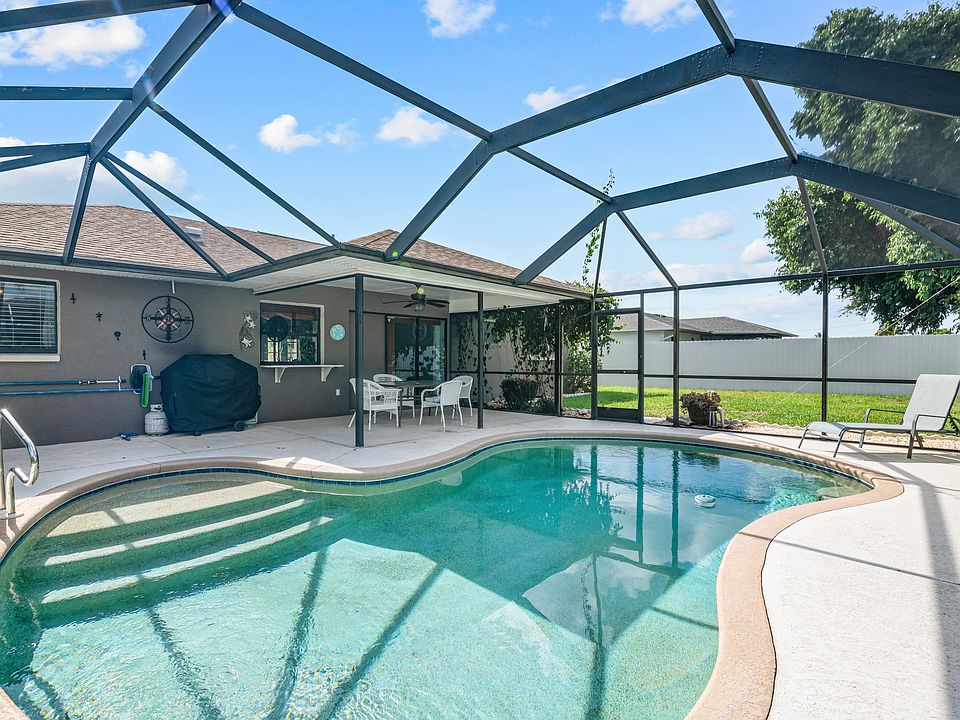 Pool Home Available Now. This 3 bedroom 2 bath home comes Fully furnished and has a beautiful heated pool! Two car garage, flat screen TVs, water softener system and Everything you'll need to move right in. Centrally located in Cape Coral near Santa Barbara and Veterans. Well maintained with a full screen room over the pool and covered Lani. Near restaurants, Lowes, Publix, Sun Splash family waterpark, shopping and schools. Lawn Service & Pool Service Included. FLS & Application Required.