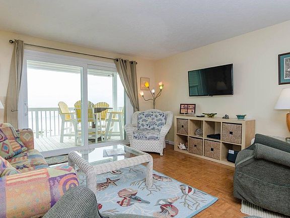 This 2 bedroom 1st floor oceanfront condo is in the Ocean Dunes complex in Kure Beach. The open design of the living room, dining area, and well equipped kitchen has breath taking views of the Atlantic. Relax in the living room with the comfortable layout and furniture (the sofas is a pullout bed) and flat screen TV. The main bedroom features a Queen bed, mounted TV, private en suite bathroom, and access to the oceanfront deck. The 2nd bedroom has 2 Twin beds, utilizing the additional full bathroom in the hallway.
